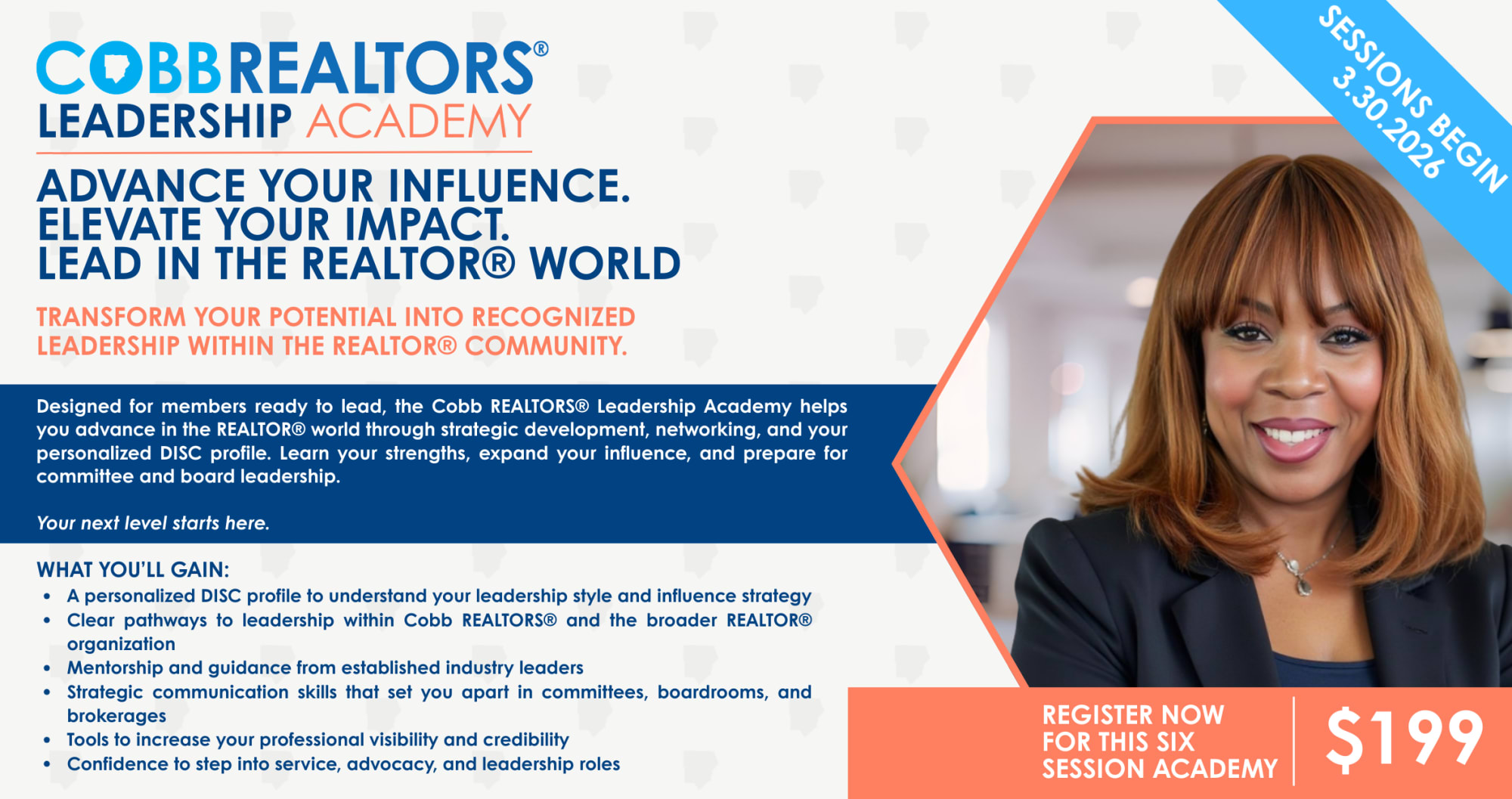 The Cobb REALTORS® Leadership Academy is designed for members who are ready to grow, serve, and advance within the REALTOR® profession. Through intentional leadership development, hands-on learning, and strategic networking, you’ll gain the tools and confidence to pursue committee roles, board service, advocacy involvement, and industry recognition.