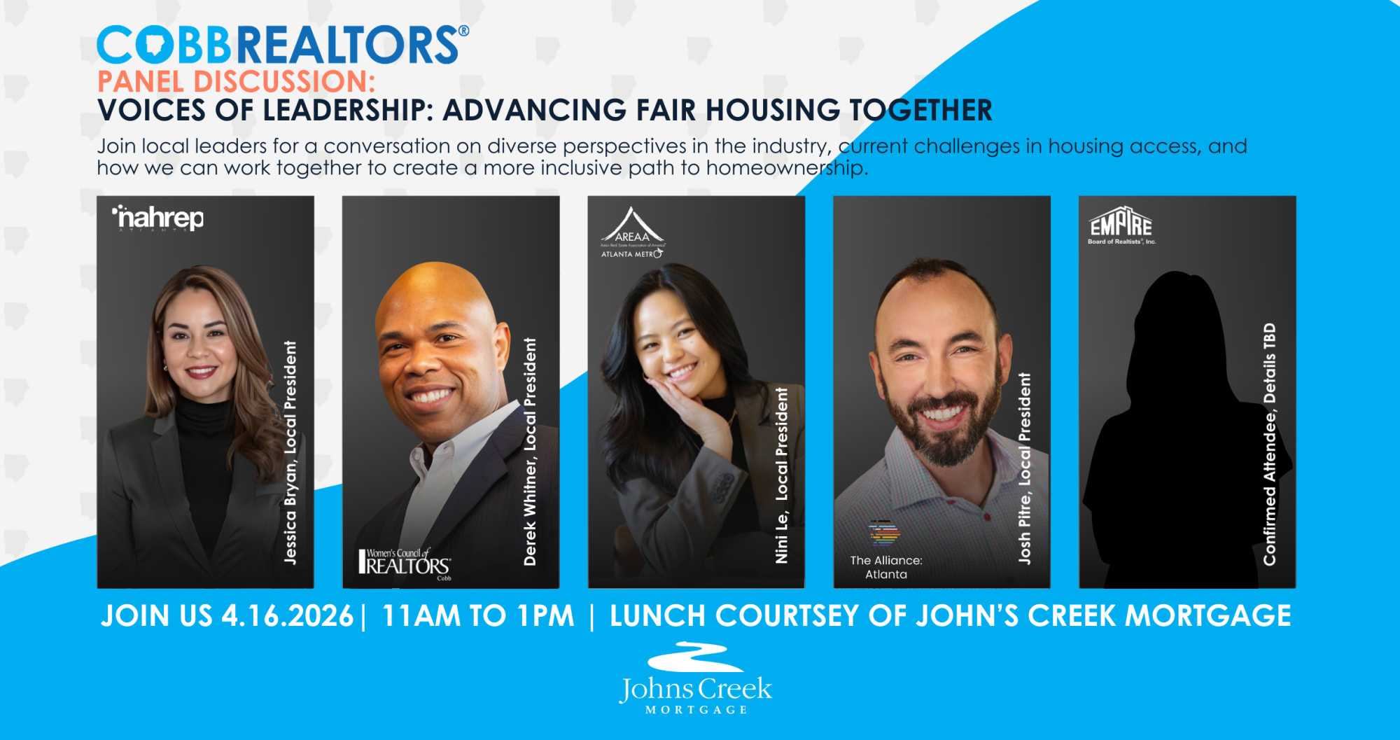 In recognition of Fair Housing Month, Cobb REALTORS® invites you to join us for a powerful leadership panel bringing together presidents and representatives from several influential real estate organizations, including NAREP, AREAA, the LGBTQ+ Real Estate Alliance, the Empire Board of Realtists, and the Women's Council of REALTORS®.