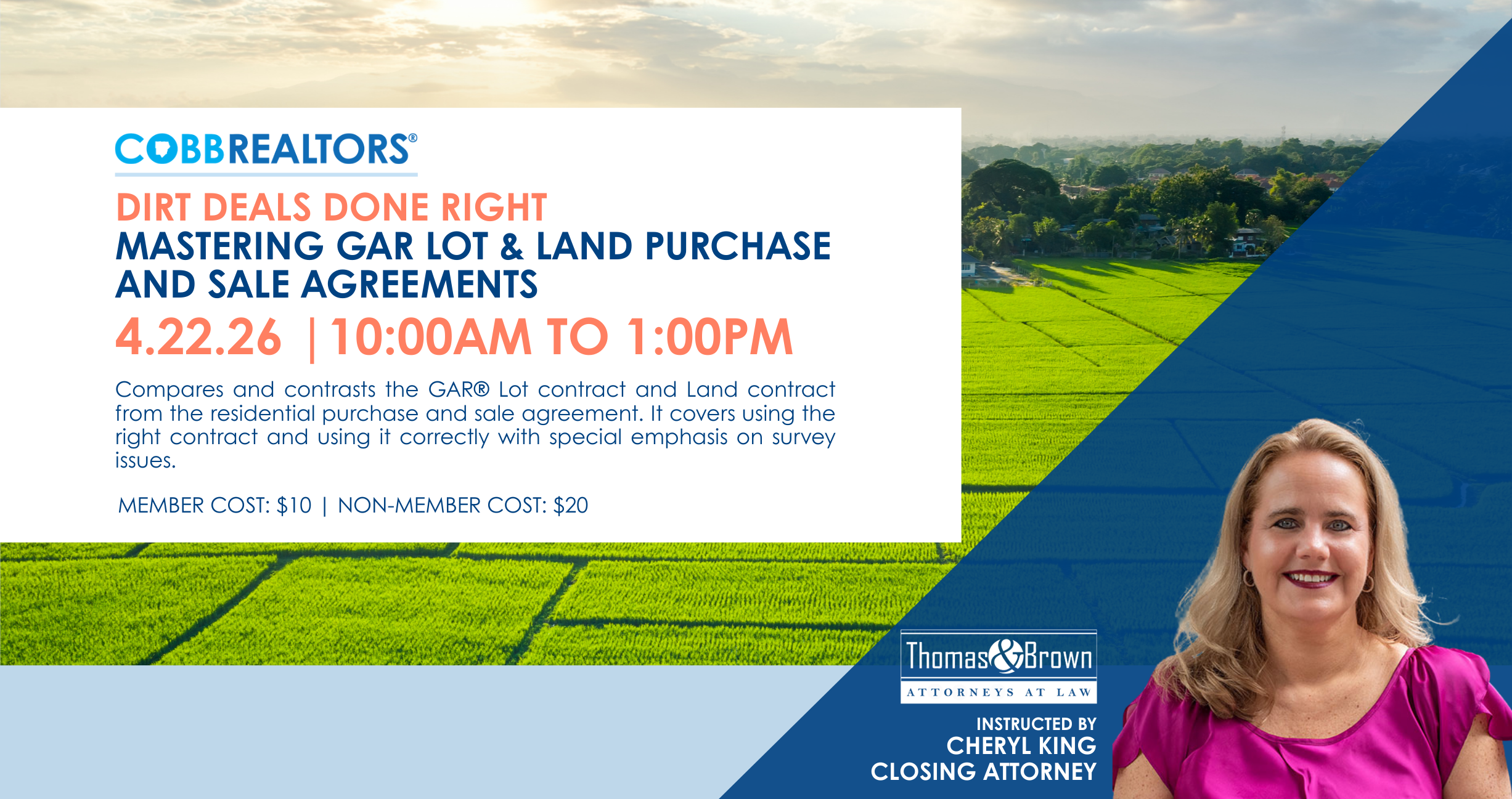 Taught by Cheryl King with Thomas & Brown. This course explores the differences between the GAR Lot and Land Purchase, the GAR Land Purchase and Sale Agreement, and the more commonly used Purchase and Sale Agreement. Also compares and contrasts the provisions of each contract and addresses the most common special stipulations and exhibits to use.