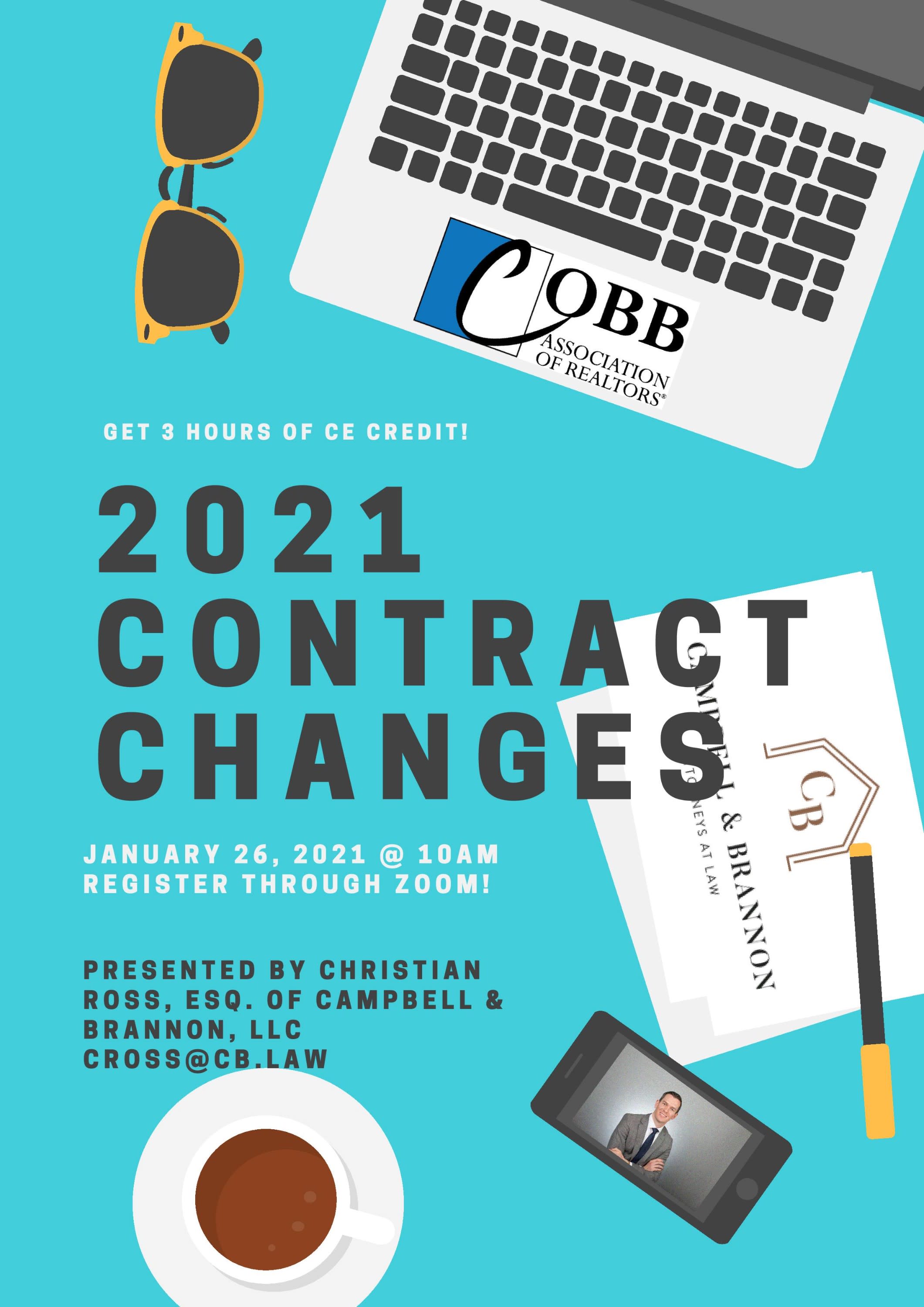 Join us to learn about the contract changes in 2021. Hosted by the Attorneys at Campbell & Brannon, LLC and Cobb Association of Realtors Instructor: Christian RossImages