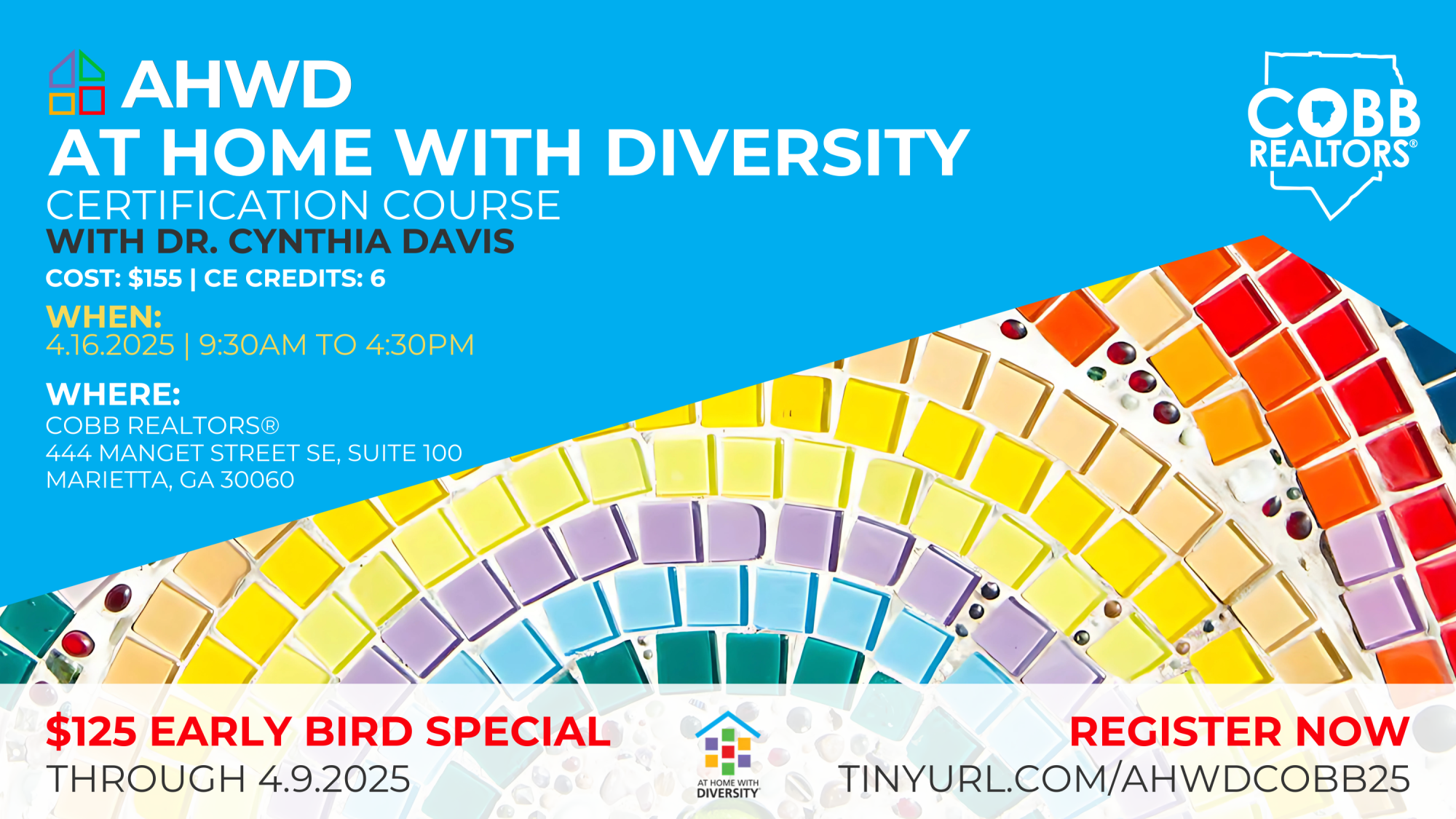 At Home With Diversity (AHWD) is an educational opportunity designed to present a picture of the changing face of the real estate industry to real estate brokers, agents, association executives, and anyone associated with the industry. The class teaches real estate professionals how they can increase their sensitivity and adaptability to future market trends. It addresses issues of diversity, fair housing, and cultural differences. Participants will learn practical skills and tools to expand business and effectively service all cultural groups.