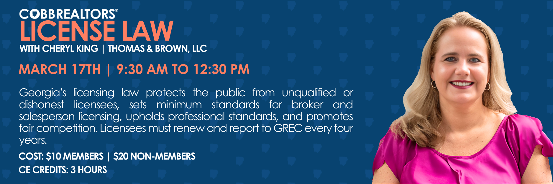 Taught By: Cheryl King CE Credits: 3 Hours Georgia’s licensing law protects the public from unqualified or dishonest licensees, sets minimum standards for broker and salesperson licensing, upholds professional standards, and promotes fair competition. Licensees must renew and report to GREC every four years.