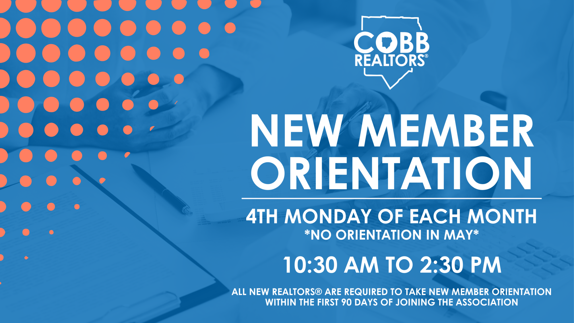 New REALTORS® are required to attend one New Member Orientation within 90 days of joining the association. For questions contact membership@cobbrealtor.com.