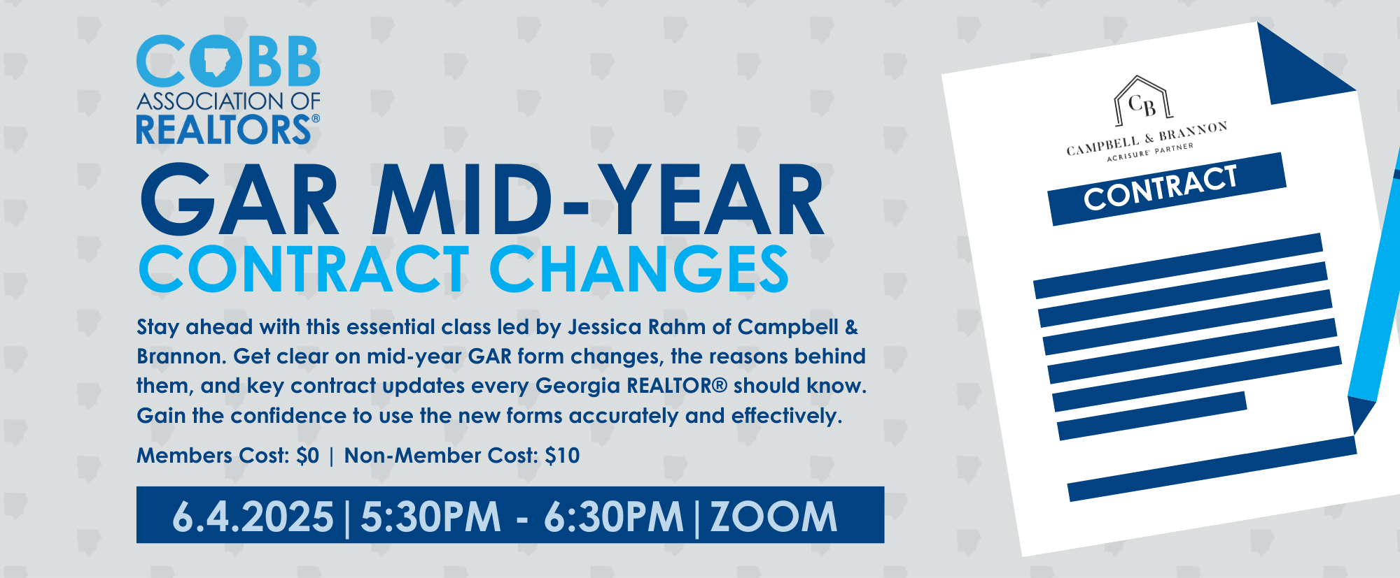 Mid-year changes go into effect June 1, 2025 Stay ahead with this essential class led by Jessica Rahm of Campbell & Brannon. Get clear on mid-year GAR form changes, the reasons behind them, and key contract updates every Georgia REALTOR® should know. Gain the confidence to use the new forms accurately and effectively.